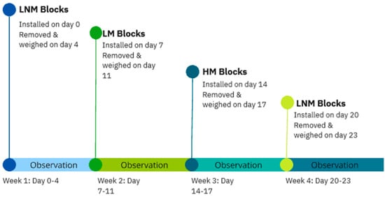 The behavioural observation of the cattle was carried out by a single observer who remained the same throughout the study to minimize subjective bias. No intra-observer reliability measures were undertaken, though all observations were based on the definitions in Table 2. Observations were carried out in a scanning method, in which the observer spent 1 min at each block, in the order from 1 to 4, for a period of an hour. This was repeated three times a day at 8 a.m., 11:30 a.m., and 2:30 p.m. This method was then repeated each day for 4 weeks (Figure 5), which amounted to 60 h of observation in real time on the farm and 900 observation points per mineral block. During the final week, week 4 of the study, on-farm construction led to the loss of a single day of data. This was accounted for later upon statistical analysis.