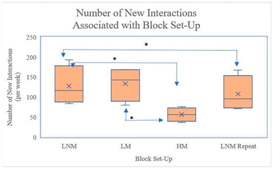 Figure 6 demonstrates that LNM had a significantly higher number of interactions compared to HM and LNM (repeat), p < 0.05. LNM had a mean difference of 71.25 new interactions when compared to the HM setup. The LM setup was also significantly increased in the number of new interactions when compared to HM, p < 0.05.