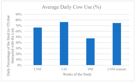 Figure 7 visualizes the true number of cows within the high-yielding herd that interacted with the licks rather than instances of interactions. The average number of cows within the herd that interacted with the lick daily was highest with the LM blocks. The LNM and LNM (repeat) were only 9.8% and 1.8% lower, respectively, to the LM blocks. However, the HM setup was used by 28.8% fewer cattle than the LM setup.