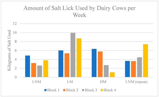 In Figure 8, the distribution of salt used paired with the block numbers and the respective block setups are displayed. This shows the sharp increase in uptake with LM blocks, specifically blocks 3 and 4. Also, cattle used approximately 30 kg of salt lick during the LM setup. In comparison to the other weeks, this was the highest amount by 10.9 kg. The week 1 LNM, had the lowest uptake of salt at 14.4 kg, a difference of 15.6 kg.