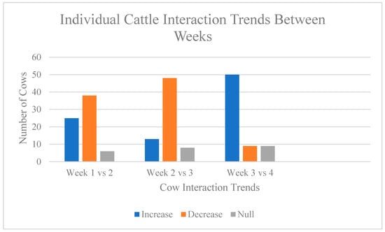 Individual Cattle Interaction Trends Between Weeks. Figure 9 shows how many cattle either increased, decreased, or stayed the same in the number of individual interactions compared week to week.