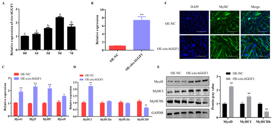 Effects of circAGGF1 on myogenesis of C2C12 cells. (A) CircAGGF1 expression patterns throughout cell differentiation. (B) CircAGGF1 transfection efficiency. (C,D) Myogenesis genes transcription in C2C12 cells following circAGGF1 overexpression. (E) Protein expression of myogenesis genes in C2C12 cells upon circAGGF1 overexpression. (F) Cell differentiation was assessed via MyHC and visualized using a fluorescence microscope. Scale bar represents 400 μm. * p < 0.05, ** p < 0.01. Different lowercase letters mean significant difference (p < 0.05).