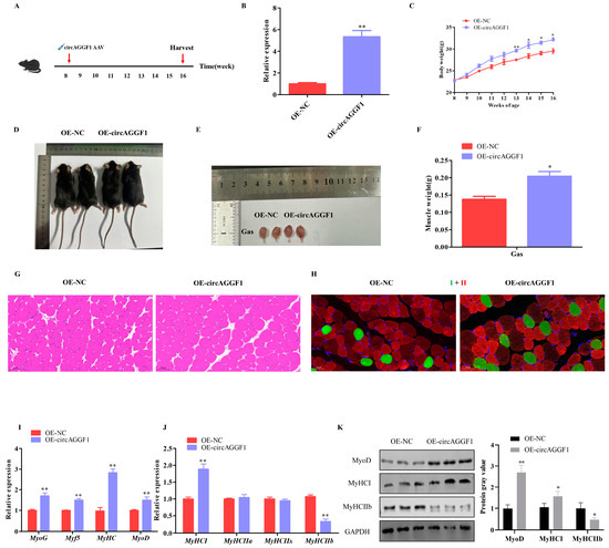 circAGGF1 Promotes mice myogenesis in vivo. (A) The animal experimental procedure. (B) Transfection efficiency of circAGGF1 in mouse muscle tissue. (C) Body weights progression in mice from 8 to 16 weeks old. (D) Gross morphology of mice in each group. (E,F) The gross morphology and weight of Gas muscle tissues. (G) HE staining. Scale bar indicates 50 μm. (H) Muscle fiber immunofluorescence. Green represents type I fibers, and red for type II fibers. Scale bar indicates 50 μm. (I–K) Expression of myogenesis genes at mRNA and protein in muscle tissue. * p < 0.05, ** p < 0.01.