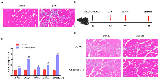 To investigate the potential regenerative capabilities enabled by circAGGF1 overexpression, cardiotoxin (CTX) was administered into the Gas muscle of the mice, inducing a controlled muscle damage scenario to enable the evaluation of subsequent repair mechanisms. HE staining revealed that the myofibers in the Gas muscle had undergone lysis, resulting in numerous scattered nuclei following treatment with CTX (Figure 3A), confirming the successful establishment of a muscle damage model in mice. Subsequently, prior to CTX injection, the mice were infected with an adenovirus-associated virus (AAV) that causes overexpression of circAGGF1 in order to maintain long-term circAGGF1 overexpression efficiency in vivo (Figure 3B). The Gas muscle was harvested for HE staining and qRT-PCR analysis at 5 and 14 days post-injury during muscle regeneration (Figure 3B), and a substantial boost in the mRNA concentrations of circAGGF1 was confirmed by day 5 post-treatment. Furthermore, amplified expressions of MyoG, MyHC, MyoD, and PAX7 were observed in the overexpression group, with respect to the control counterparts (Figure 3C). HE staining revealed a reduction in muscle lysis in the circAGGF1 overexpression group at 5 days following CTX treatment; by 14 days, this cohort had developed an increased amount of new, smaller muscle bundles compared to the control (Figure 3D). These findings imply collectively that the overexpression of circAGGF1 promotes the recovery of Gas muscle following CTX-induced injury in an in vivo setting.