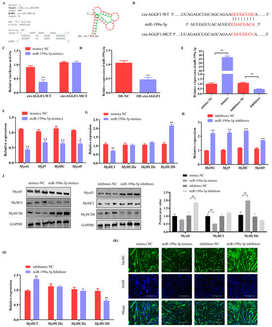 miR-199a-3p inhibits myogenesis in C2C12 Cells. (A) Predicted binding sites of circAGGF1 to miR-199a-3p using RNAhybrid software (http://bibiserv.techfak.uni-bielefeld.de/rnahybrid). (B) Schematic diagram of circAGGF1 wild-type and mutant luciferase vector construction. (C) Dual luciferase activity assay. (D) Effects of circAGGF1 on miR-199a-3p expression. (E) The miR-199a-3p overexpression and interference efficiency assay. (F,G) The mRNA expression of myogenesis genes in C2C12 cells that overexpress with miR-199a-3p. (H,I) The mRNA expression of myogenesis genes in C2C12 cells that Interference with miR-199a-3p. (J) Protein expression of MyoD, MyHCI, and MyHC IIb. (K) Results of circAGGF1 on myotube production. Scale bar indicates 400 μm. * p < 0.05, ** p < 0.01.