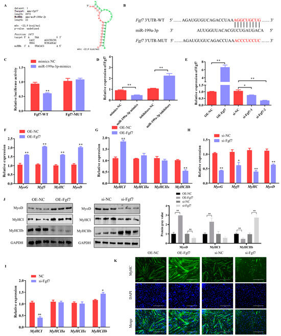 Fgf7 promotes myogenesis in C2C12 Cells. (A) Predicted binding sites of miR-199a-3p to Fgf7 using RNAhybrid software. (B) Schematic diagram of Fgf7 wild-type and mutant luciferase vector construction. (C) Dual luciferase activity assay. (D) Effects of miR-199a-3p on Fgf7 expression. (E) The Fgf7 overexpression and interference efficiency assay. (F,G) The mRNA expression of myogenesis genes in C2C12 cells that overexpress with Fgf7. (H,I) The mRNA expression of myogenesis genes in C2C12 cells that Interference with Fgf7. (J) Protein expression of MyoD, MyHCI, and MyHC IIb. (K) Results of Fgf7 on myotube production. Scale bar indicates 400 μm. * p < 0.05, ** p < 0.01.
