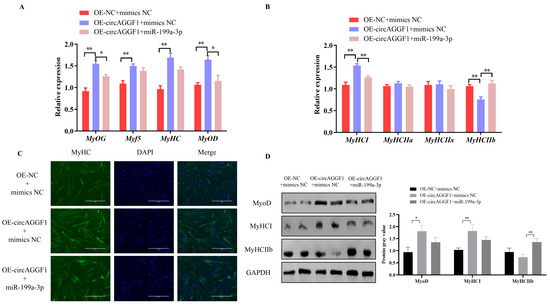 circAGGF1 influences myoblast differentiation and the transformation of myofiber types in C2C12 cells via miR-199a-3p. (A) Expression changes of key myogenic factors after transfection with OE-NC + mimics NC, OE-circAGGF1 + mimics NC, and OE-circAGGF1+ miR-199a-3p. (B) Expression changes of key myofiber-type factors after transfection with OE-NC + mimics NC, OE-circAGGF1 + mimics NC, and OE-circAGGF1 + miR-199a-3p. (C) Immunofluorescence staining results after transfection with OE-NC + mimics NC, OE-circAGGF1 + mimics NC, and OE-circAGGF1 + miR-199a-3p. Blue indicates nuclei stained with DAPI; green indicates MyHC protein. Scale bar indicates 400 μm. (D) Protein expression of MyoD, MyHCI, and MyHC IIb. * p < 0.05, ** p < 0.01.