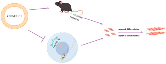 It was noted in this study that the initial rise in circAGGF1 expression was followed by a decremental phase associated with myoblast differentiation, hinting at the potential pivotal involvement of circAGGF1 in the orchestration of myoblast differentiation processes. This hypothesis was validated further by investigations of the specific role played by circAGGF1 in myogenesis within myoblasts. The present study has revealed the dual role of circAGGF1 in myoblast differentiation, promoting both this process and the concurrent expression and inhibition of MyHCI and MyHCIIb, respectively. Additionally, in vivo assays performed within murine models unveiled the capability of circAGGF1 to catalyze skeletal muscle advancement and to augment the ratio of type I muscle fibers, which are vital components for sustaining physical endurance and corporal equilibrium that contract slowly and can sustain prolonged activity without significant fatigue [20]. These fibers, rich in mitochondria, are the primary sites for aerobic metabolism. By using oxygen to oxidize fats and glycogen, they produce ATP as a continuous source of energy for muscle contraction [21]. Therefore, type I muscle fibers possess a high oxidative metabolic capacity. Previous studies showed that circDdb1 can bind to eEF2 by encoding a novel protein, circDdb1-867aa. This increases the level of phosphorylation, mitigating protein translation and promoting muscle atrophy [22]. Concurrently, FoxOs modulate the transcription of genes implicated in the wasting of skeletal muscle (including MAFbx and MuRF1), along with genes related to autophagy, via twin proteolysis routes: the ALP and UPS [23,24,25,26]. The overexpression of circTmeff1 prompts muscle atrophy, mediated by direct interaction with TDP-43 and the encoding of a protein, TMEFF1-339aa [27]. It was demonstrated that circFUT10 regulates the regenerative potential of aged skeletal muscle stem cells through the targeting of HOXA9. CircFUT10 overexpression promotes self-renewal and muscle regeneration in aged stem cells, whereas its inhibition significantly impairs cell proliferation and reduces regenerative capacity [28]. The present study has further illustrated that circAGGF1 can facilitate recovery and regeneration following skeletal muscle injury in mice.