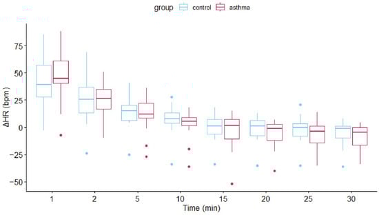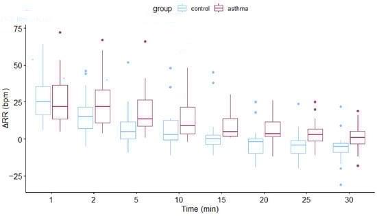 There was a significant effect of time on ΔHR and ΔRR (p < 0.001) in the repeated measures ANOVA. Both variables decreased over time. Asthma also significantly affected ΔRR with lower values in the asthmatic group (p < 0.001). However, while both time and group had significant effects on ΔRR, the changes over time were similar between the two groups (non-significant interaction term). Recovery after exercise is shown in Figure 2.