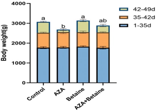 Figure 1. Effects of different supplemental treatments on the body weight of geese from 35 to 49 days of age. (1) The control group was treated with normal saline intraperitoneally (I.P.); the AZA group was treated I.P. with AZA (2 mg/kg); the betaine group was fed with betaine through the diet and treated I.P. with normal saline (1.2 g/kg); the AZA+betaine group was fed with betaine through the diet and treated I.P. with AZA. (2) Values are presented as means and standard error of the means (n = 7). Values followed by different letters superscript indicate significant differences (p < 0.05).