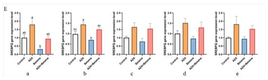 To further elucidate the relationship between gene expression and DNA methylation, we also investigated the effects of AZA on the expression of fatty acid synthesis-related genes, including FAS, ACC, SCD, and SREBPQ1. The first three genes express the most important enzymes in fatty acid synthesis, while SREBP primarily regulates fatty acid synthesis at the transcriptional level [39]. Compared to the control group, the expression levels of FAS, ACC, SCD, and SREBPQ1 genes in the betaine group were reduced to varying extents. Similarly, in broilers, the incorporation of betaine into the feed significantly decreased FAS gene expression in the liver [40]. A related study indicated that the addition of methyl donors to the diet of mice can lead to hypermethylation of the FAS gene promoter and consequently inhibition of the gene expression [41]. Furthermore, another research study showed that adding methyl donors diminished the translation and transcription of ACC and thereby inhibited the gene expression [42]. A similar trend was observed in SREBP-1c expression in mice [43]. In this study, treatment with AZA increased the gene expression of FAS, ACC, SCD, and SREBPQ1, further indicating that the elevated expression of these genes is associated with DNA demethylation. A previous study found that AZA treatment enhanced the expression of 5-fluorouracil by demethylation [44]. The findings from these experiments confirm that DNA methylation is negatively correlated with gene expression, a trend consistent with the results obtained in this study.