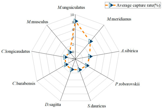 The dominant species of rodent communities play a vital role in the ecosystem. Through field investigation, a total of 700 rodents were captured, comprising nine species: Meriones unguiculatus (Milne-Edwards, 1867), Spermophilus dauricus (Brandt, 1843), Meriones meridianus (Pallas, 1773), Allactaga sibirica (Forster, 1778), Cricetulus barabensis (Pallas, 1773), Phodopus roborovskii (Satunin, 1903), Cricetulus longicaudatus (Milne-Edwards, 1867), Mus musculus (Linnaeus, 1758), and Dipus sagitta (Pallas, 1773). Statistical analysis identified M. unguiculatus, M. meridianus, A. sibirica, and P. roborovskii as the dominant species in the area (Figure 2).