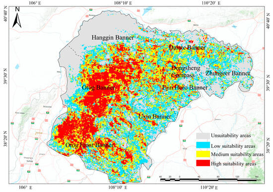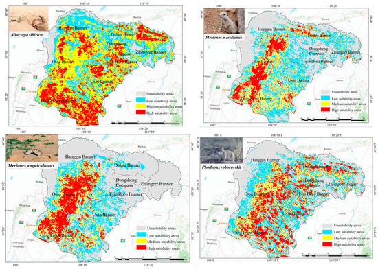 Based on the model results, it is evident that among all rodent species, A. sibirica has the largest suitable habitat area, covering approximately 89% of the study area. The suitable habitat for P. roborovskii covers about 68% of the study area, that of M. meridianus covers around 63%, and finally that of M. unguiculatus covers approximately 50% (Figure 9 and Figure 10). Specifically, the main suitable habitat areas for A. sibirica are located in the southern and western parts of Ordos; the primary suitable habitats for M. meridianus and M. unguiculatus are concentrated in Otog Front Banner, Otog Banner, and Hanggin Banner; while the distribution of P. roborovskii is more dispersed, with suitable habitats found in various parts of the region. Considering these four species collectively, the regions of Wushen Banner, Otog Banner, and Otog Front Banner have the highest proportions of highly suitable habitats within the city. Actual survey data show that rodent community capture rates are highest in Wushen Banner at 23.38%, followed by Otog Front Banner at 10.76%, and Otog Banner at 7.25%. Therefore, the model simulation results of this study are consistent with actual survey findings.