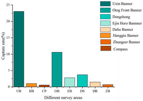 The MaxEnt model prediction results indicate that, under baseline climate conditions, the primary suitable habitats for small rodents are mainly located in the western and southern parts of the Ordos desert steppe (Figure 4), covering 4.44% of the total area. The moderately suitable habitats are primarily found at the edges of the highly suitable areas. Highly suitable areas account for 20.5% of the city’s total area, while non-suitable areas cover 30.9% (Table 2). Actual survey results show that rodent community capture rates are highest in Wushen Banner, reaching 23.38%, followed by Otog Front Banner at 10.76%, and Otog Banner at 7.25%. These actual survey results are consistent with the model predictions (Figure 5).