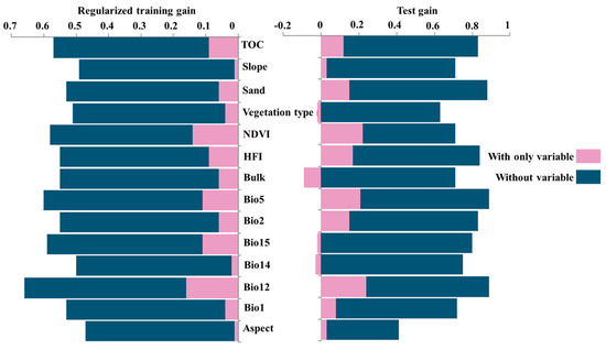 The model results indicate that NDVI, Bio12, and TOC are key drivers of habitat suitability for small rodents in this region, with a cumulative importance value of 56.1% (Table 3). The jackknife test of the 15 environmental variables also shows that, in the single-variable model, the environmental variables with the highest gains in regularized training, testing, and AUC values are NDVI and Bio12. Bio5 also contributes significantly, indicating that these factors have high predictive capabilities (Figure 6). Overall, the primary factor affecting the geographic distribution of small rodents in this region is the vegetation condition, followed by significant influences from precipitation and total organic carbon content.