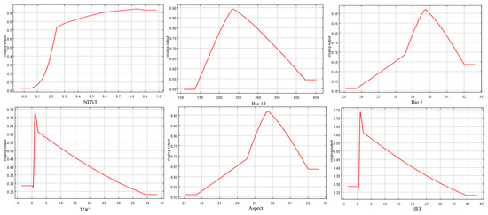 After extracting the dominant environmental factors for separate analysis, the significant influencing factor ranges for highly suitable distribution areas for small rodents under baseline climate conditions are as follows: NDVI > 0.25; Bio12 of 200–300 mm; Bio5 between 29 °C and 30.8 °C; TOC content at 2 mg/kg. These areas are predominantly found on sunny slopes. Habitat suitability increases with human disturbance values up to a threshold of 6.5, beyond which suitability decreases progressively as HFI increases further (Figure 7 and Figure 8).