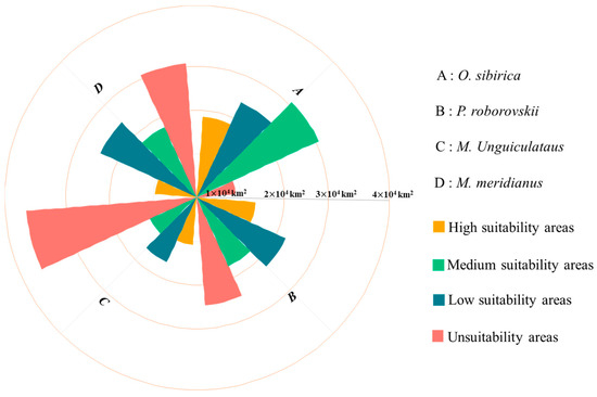 The distribution of rodents in Ordos desert grassland exhibits significant regional differences, being more concentrated in the western and southern parts of Ordos. Differences in spatial use can effectively promote species coexistence. On a larger scale, species with similar ecological characteristics tend to select similar resource spaces to facilitate coexistence, rather than eliminating spatial competition [47]. A. sibirica (89%), P. roborovskii (68%), M. meridianus (63%), and M. unguiculatus (50%) have the largest suitable habitat areas in this region and are representative rodent species of the desert grassland habitat. Their ecological habits are similar, and their spatial distribution overlaps significantly.