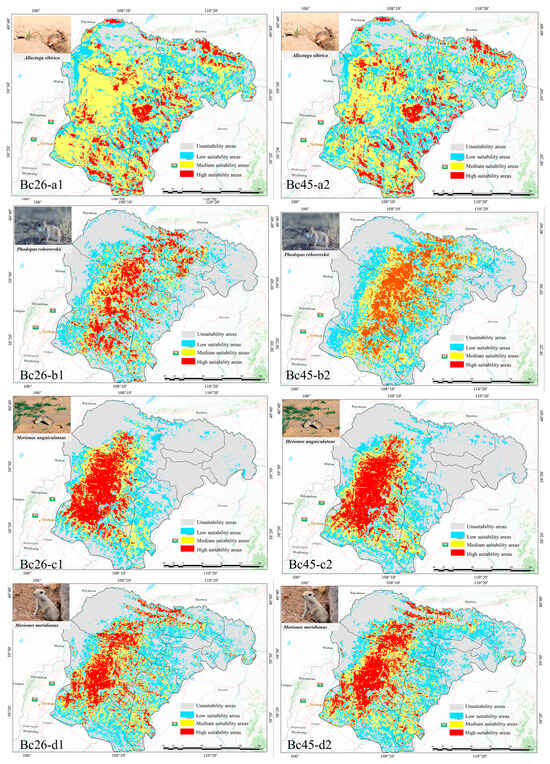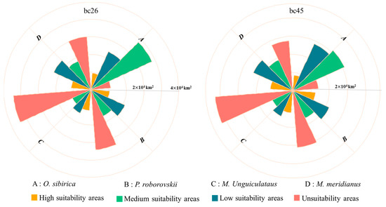 Conversely, for gerbil species (includes M. meridianus and M. unguiculatus), the area of high-suitability habitat increases with climate warming. The high-suitability habitat area for M. unguiculatus increases by 1271 km2 (11.68%) under the Bc45 emissions scenario, and it increases for M. meridianus by 2654 km2 (27.49%). This result may be due to the strong tolerance of gerbil species to high-temperature environments. In the Bc26 emission scenario, the change trend in high-suitability habitat areas for different rodent species was the same as that of the bc45 emissions scenario.