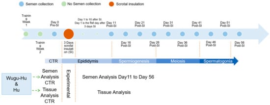 (Summary of the experimental procedures and phases of sperm production expected to be manifested in semen against time from scrotal insulation (SI). Semen collected on day 11 was presumed to be epididymal at SI, days 16, 21, and 26 reflect sperm in spermiogenesis at SI; days 31, 36, and 41 are the meiosis stage; and days 46 and 51 are presumed to be the spermatogonia stage.