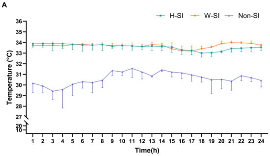 The average surface temperature of the scrotum for Hu sheep scrotal insulation group (H-SI), Wugu–Hu sheep scrotal insulation group (W-SI), and control group (Non-SI) across the 72 h of insulation were 33.58 ± 0.94 °C, 33.69 ± 1.02 °C, and 30.63 ± 2.54 °C, respectively, with little diurnal variation in the insulation groups (Figure 2A). There was no difference (p = 0.10) between the scrotal temperatures of Hu and Wugu–Hu rams. The temperature of the two scrotal insulation groups was higher than that of the controls (p < 0.01).