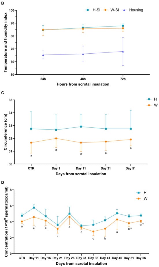 (A) Scrotal surface temperature. Each hourly data point is the mean of all measurements for all rams in the 3 recordings in each hour and the 3 days of recording. (B) Comparison between housing THI and scrotal insulation THI. (C) Scrotal circumference. (D) The semen concentration. CTR: pre-scrotal insulation; Day 11–56: post-scrotal insulation; H: Hu ram; W: Wugu–Hu ram; H-SI: Hu ram with scrotal insulation bag; W-SI: Wugu–Hu ram with scrotal insulation bag; non-SI: ram without scrotal insulation. a, b, c: Differing subscripts denote a significant difference within group compared to CTR, with a: no significant difference (p > 0.05); b: significant difference (p < 0.05); and c: highly significant difference (p < 0.01). * Significant difference between groups on the same day (p < 0.05); ** highly significant difference (p < 0.01). Lack of differing superscripts indicates p > 0.05.