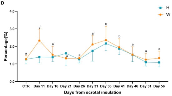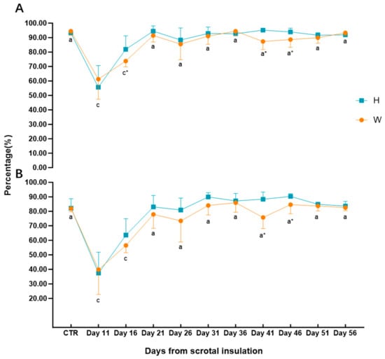 Figure 2D shows the variation in sperm concentration. Significant differences to the CTR were observed on Days 21, 31, and 36 (p < 0.01) and Day 41 (p < 0.05) in group W. Compared to pre-insulation values, significant differences were observed on Days 11, 21, 31 and 36 (p < 0.01) and Day 41 (p < 0.05) in group H. In comparison between the two groups, significant differences were observed on CTR (p < 0.01), Day 11 (p < 0.05), and Days 51 and 56 (p < 0.01). The mean concentration in post-insulation was 3.79 × 109 count/mL (99% CI: 3.10 × 109 to 4.47 × 109 count/mL) for group W and 4.49 × 109 count/mL (99% CI: 3.72 × 109 to 5.25 × 109 count/mL) for group H.