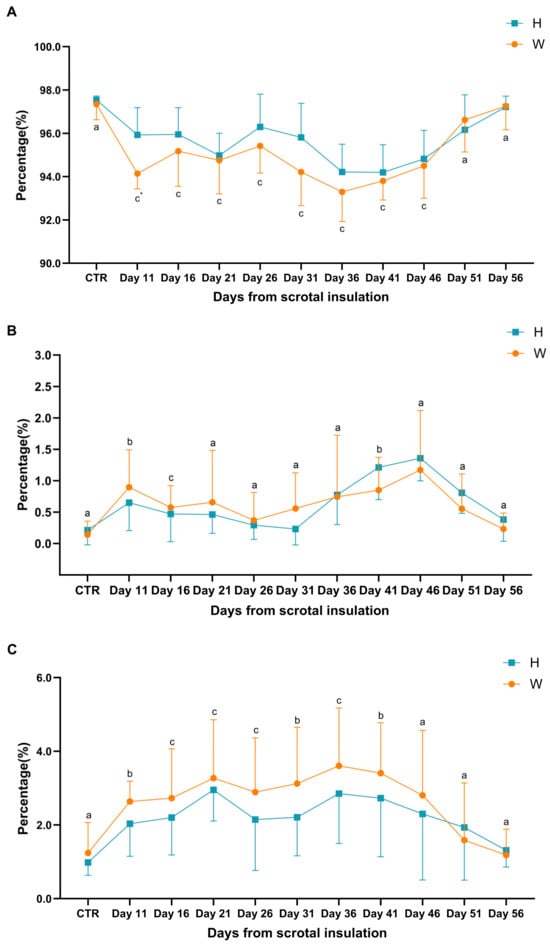 Compared to pre-insulation (CTR), there was a significant post-insulation decrease in progressive motility in Hu rams (group H) on Days 11 and 16 (p < 0.05), returning to pre-scrotal insulation levels on Day 21 and remaining stable (Figure 3B). Changes in Wugu–Hu (group W) and Hu rams (group H) were similar, with lower total sperm motility in Wugu–Hu rams on Days 41 and 46 than Hu rams (p < 0.05) (Figure 3B).