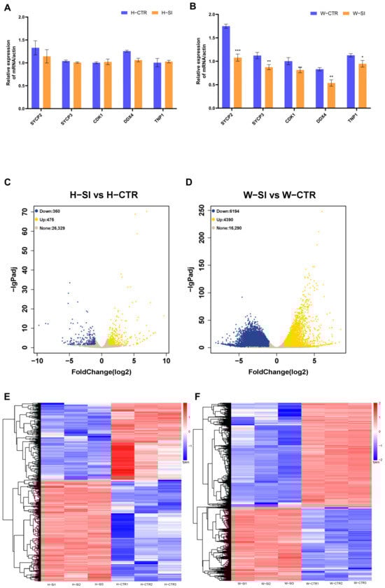(A,C,E) RT-qPCR, volcano plot and heat map of DEGs in H-SI vs. H-CTR. (B,D,F) RT-qPCR, volcano plot and heat map of DEGs in W-SI vs. W-CTR. (E,F) Rows represent individual genes, and columns correspond to samples, with red indicating high gene expression and blue indicating low expression genes. The horizontal axis displays the clustering of the samples, and the vertical axis represents the clustering of the genes. * p < 0.05, ** p < 0.01, *** p < 0.001; Lack of differing superscripts indicates p > 0.05.