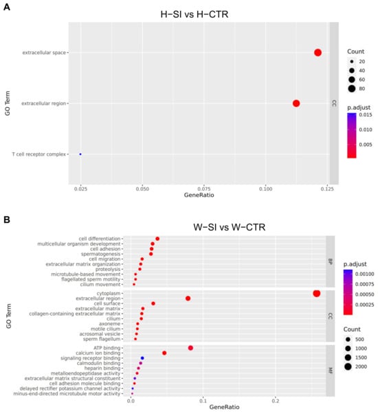 GO is divided into three ontologies: Molecular Function (MF), Cellular Component (CC), and Biological Process (BP). In this analysis, the top 10 most significant categories (or all categories if fewer than 10) were selected for visualization of the GO enrichment analysis results using a dotplot, as shown in Figure 6A (H-SI vs. H-CTR) and Figure 6B (W-SI vs. W-CTR).