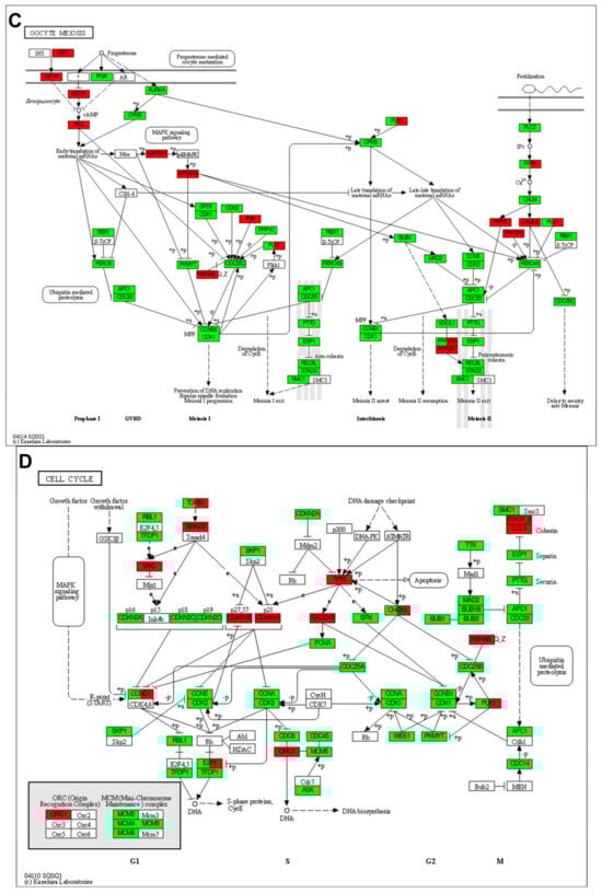 KEGG pathway enrichment analysis was performed for the two comparison groups. In the Hu sheep group, no pathways were significantly enriched for DEGs, but multiple pathways were significantly enriched in the Wugu–Hu sheep group. Further analysis of the W-SI vs. W-CTR comparison using the KEGG pathway database identified two significantly enriched pathways related to spermatogenesis: Oocyte meiosis and cell cycle (Figure 6C,D). Seventy-five DEGs in the Oocyte meiosis pathway were significantly enriched (p = 0.0002), including 27 upregulated DEGs and 48 downregulated DEGs (Table S4). Seventy-two DEGs in the cell cycle pathway were significantly enriched (p = 0.015), comprising 21 upregulated DEGs and 51 downregulated DEGs (Table S4).