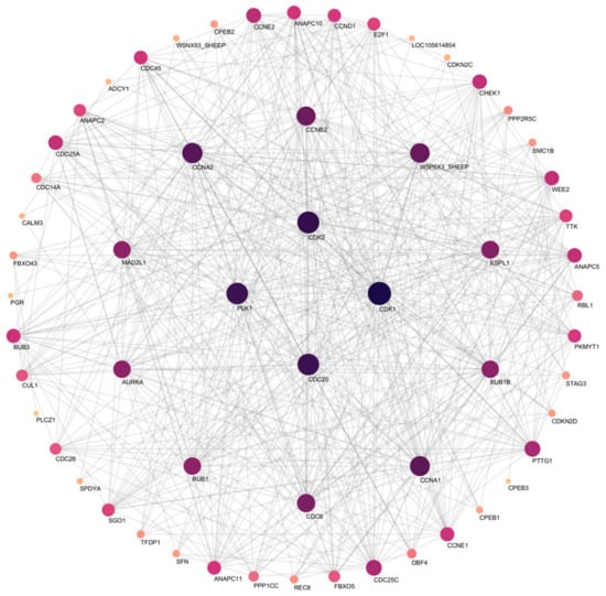 PPI network analysis. Node size and color intensity correspond to the degree of connectivity, with darker and larger nodes representing genes with higher interaction degrees.