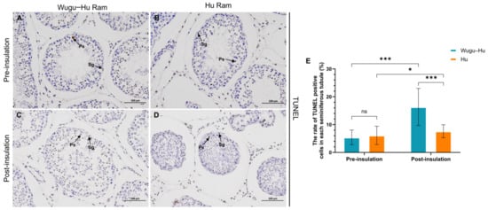 A total of 50 seminiferous tubules were randomly selected from each sample group for TUNEL analysis of cell apoptosis. TUNEL positive cells are demonstrated in Figure 8 A–D. The proportion of TUNEL positive cells per seminiferous tubule was higher after scrotal insulation in both the Wugu–Hu and the Hu rams (Figure 8E), with p < 0.01 and p < 0.05, respectively (Figure 8E). The Wugu–Hu post-insulation shows a significantly higher rate of TUNEL positive cells compared with Hu ram post-insulation. The results indicate that mild scrotal heat stress increased testicular cell apoptosis of both sheep breeds at different levels.