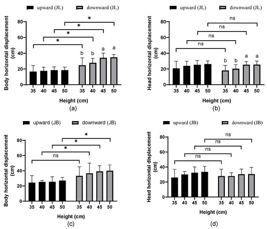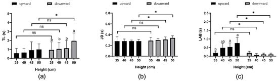 | Categories | Perching Platform Height (cm) | Upward Jump (°) | Downward Jump (°) | p-Value |