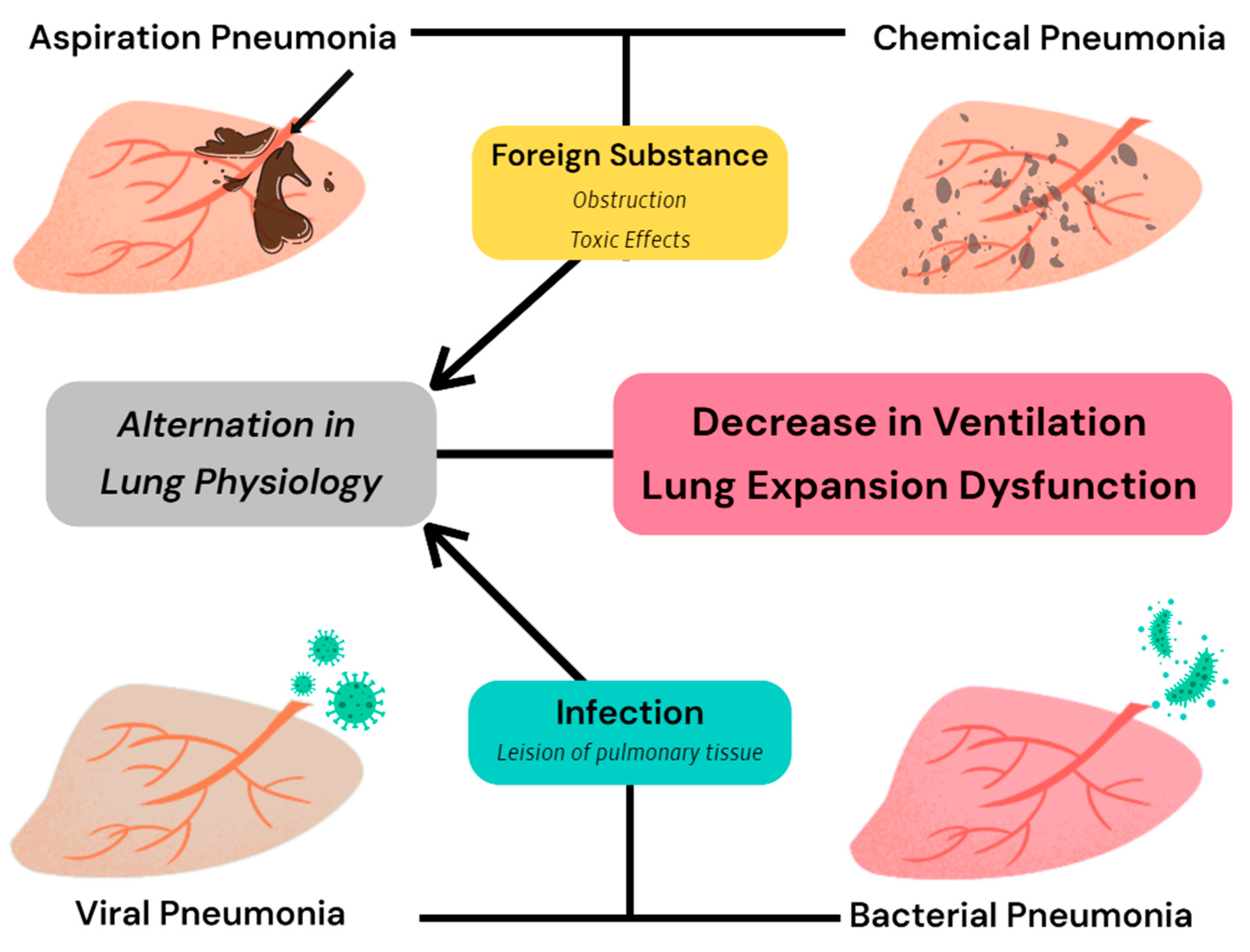 | Pneumonia | Lung expansion inhibition Chest volume restriction Surfactant reduction | Reduce | [33,34,35] |