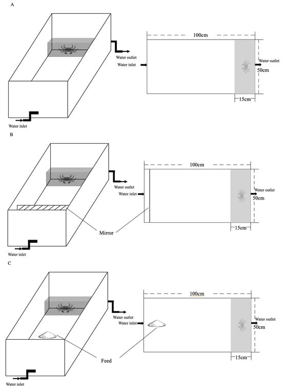 To test and characterize the individual personality behavioral phenotypes of boldness and aggression in Chinese mitten crab, we subjected 30 juveniles and 30 adults to three sequential tests (Figure 1)—an inherent personality behavior test under control conditions (refer to as IP group), a personality behavior test under crowding stress conditions (referred to as SP group), and a test under food odor stimulus group (referred to as FP group). One end of the experimental tank was connected to the water inlet pipe as the upstream end and the other end was connected to the outlet pipe as the downstream, with a consistent water velocity of 0.1 m/s. In the behavior test under crowding stress conditions, a mirror (50 cm × 25 cm) fixed on the end of the observation zone was employed to create a visual cognition of increased population density, and thus to mimic a crowding stress environment. The purpose of setting up a mirror was to simulate the presence of additional crabs, enhancing the perceived density within the enclosure. To avoid excessive stress responses that affect the normal behavior of animals, we just set up a mirror in the box. In the behavior test under food odor stimulation, 10 ± 1 g of commercial feed pellets was stored in a perforated pipe located near the upstream water inlet pipe, allowing the odors of food to reach the crabs with the current. At the end of each test, the crabs were then returned to their home tanks to rest for three days and were fasted for 12 h before the next test in order to standardize hunger level.