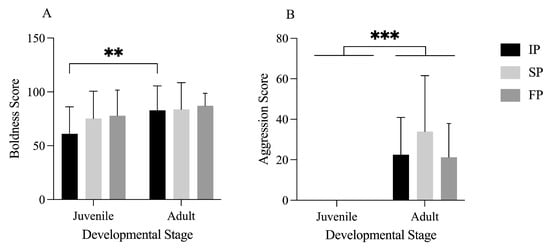 Comparative analysis of the boldness and aggression of juvenile and adult Chinese mitten crabs. (A) is a comparative analysis of the boldness of juvenile and adult crabs, and (B) is a comparative analysis of the aggression of juvenile and adult crabs. ** and *** indicate p < 0.01, and p < 0.001, respectively.
