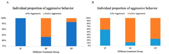 The proportion of aggressive behaviors in each group of juvenile (A) and adult (B) crabs.