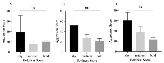 Comparative analysis of aggression of adult crabs with different levels of boldness; (A) is the relationship between boldness and aggression of adult crabs, (B) is the relationship between boldness and aggression of adult crabs under population pressure, and (C) is the relationship between boldness and aggression of adult crabs under feed odor stimulation. Data are shown as mean ± SD (n = 30); ns, not significant (Kruskal–Wallis test).