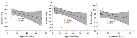Regression analysis of boldness and aggression in adult crabs. (A) is the regression analysis of boldness and aggression in the IP group of adult crabs that showed aggressive behavior; (B) is the regression analysis of boldness and aggression in the SP group of adult crabs that showed aggressive behavior, and (C) is the regression analysis of boldness and aggression in the FP group of adult crabs that showed aggressive behavior. The gray areas in the figure represent confidence intervals, the black dots represent individual personality ratings, and * represents p < 0.05.