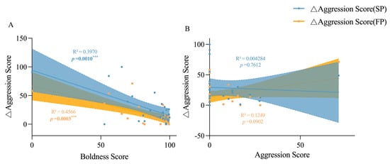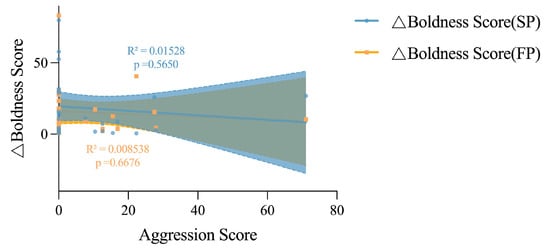 Linear relationships between the change value of boldness score and aggression score of adult crabs. The yellow area represents the confidence interval between the bravery score and the bravery score difference of group SP, and the blue area represents the confidence interval between the bravery score and the bravery score difference of group FP.