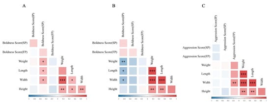 The heat map of the correlation between personality and morphological characteristics of Chinese mitten crab. (A) is the heat map of juvenile boldness score and morphological characteristics, (B) is the heat map of adult boldness score and morphological characteristics, and (C) is the heat map of adult aggression score and morphological characteristics. *, **, and *** indicate p < 0.05, p < 0.01, and p < 0.001, respectively.