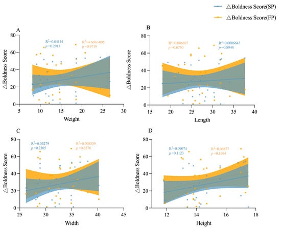Linear relationships between the boldness score change value and morphological characteristics of juvenile crabs. (A) is the linear relationship between the boldness score change value and weight of juvenile crabs, (B) is the linear relationship between the boldness score change value and body length of juvenile crabs, (C) is the linear relationship between the boldness score change value and body width of juvenile crabs, and (D) is the linear relationship between the boldness score change value and body height of juvenile crabs.