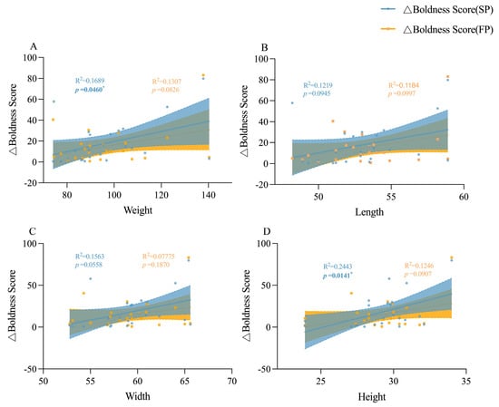 Linear relationships between the boldness score change values and morphological characteristics of adult crabs. (A) is the linear relationship between the boldness score change value and weight of adult crabs, (B) is the linear relationship between the boldness score change value and body length of adult crabs, (C) is the linear relationship between the boldness score change value and body width of adult crabs, and (D) is the linear relationship between the boldness score change value and body height of adult crabs. * indicates p < 0.05.