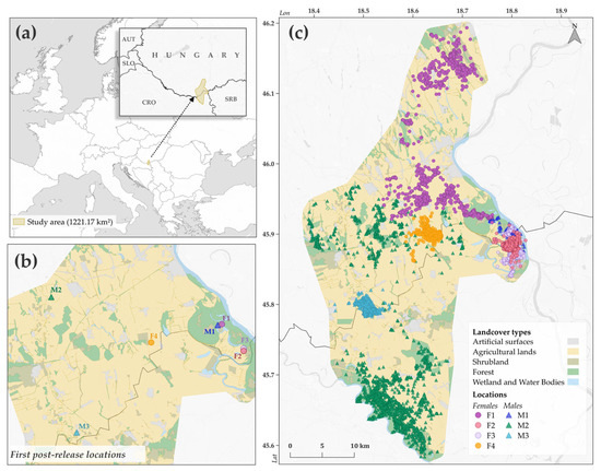 | Agricultural and open fields with forests fragments, hedgerows, and lush vegetation bordering water channels, Serbia [8] | 4 | Home range: 9.16 ± 7.32 km2 | MCP95 |