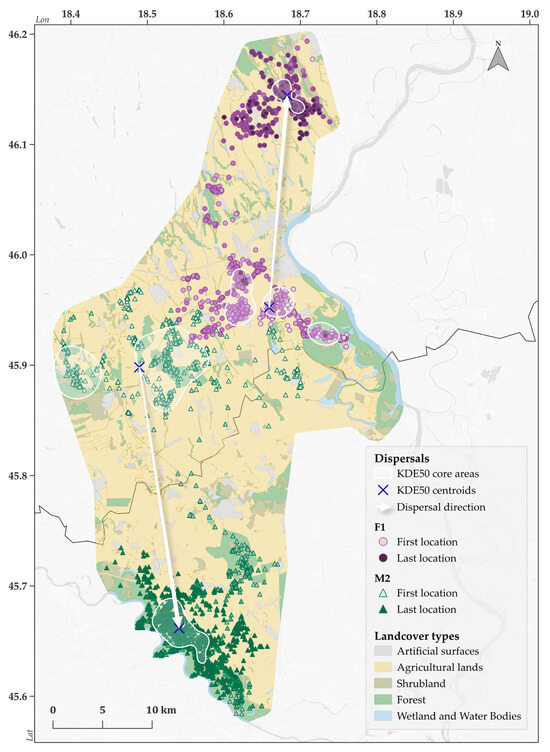 | Forest–agricultural habitats and with a high forest cover, Hungary [10] | 45 | Home range: 14.4 ± 2.3 km2 | KDE95 |