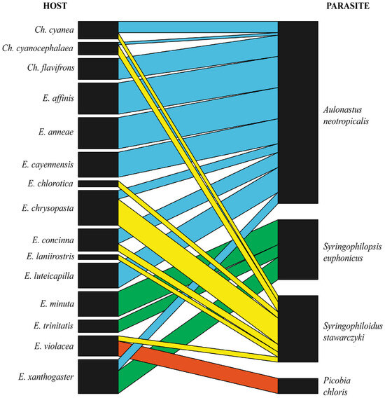 In this study, we identified 4 species of quill mites parasitising 15 host species of Euphoninae, whereas previously, only a single quill mite species had been recorded from a single Euphoninae host. This significantly expands our understanding of syringophilid mite diversity in this bird group and highlights the complexity of their host–parasite associations. The phylogenetic and biogeographical history of Euphoninae has likely played a key role in shaping the distribution and specialisation of their associated parasites. While some species, such as Aulonastus neotropicalis sp. n. and Syringophiloidus stawarczyki, exhibit broad oligoxenous parasitism and were likely present on the last common ancestor of Chlorophonia and Euphonia, others—like Syringophilopsis euphonicus sp. n.—show a more restricted host association. The absence of S. euphonicus sp. n. in Chlorophonia may be attributed to the “missing the boat” phenomenon or competitive exclusion by Syringophiloidus stawarczyki. Network analysis of quill mite–Euphoninae interactions revealed a moderately specialised system, with most mites exploiting multiple hosts while maintaining distinct ecological preferences. The observed values suggest that quill mites tend to avoid sharing the same host, likely due to competitive exclusion and niche differentiation. The lack of co-occurrence among species occupying similar microhabitats, such as wing coverts or contour feathers, further supports this pattern. These findings align with broader host–parasite co-evolutionary trends, where specialisation and competition drive structured interactions within parasite communities.