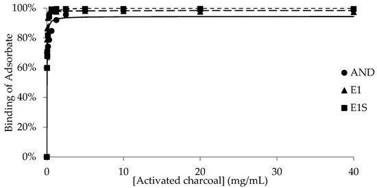 Binding of androstenone (AND), estrone (E1), and estrone sulfate (E1S) by 0.039–40 mg/mL of activated charcoal diluted in pH 7.4 phosphate-buffered saline.