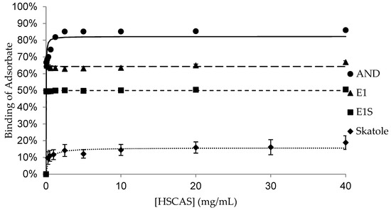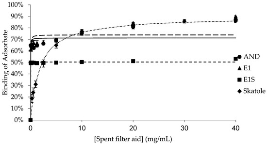 The binding of the adsorbates (AND, E1, E1S and skatole) to different concentrations of each adsorbent is shown in Figure 1, Figure 2, Figure 3, Figure 4 and Figure 5, with the detailed kinetic parameters describing the binding capacity (Bmax) and affinity (K) summarized in Table 1. The binding curves produced using AC as an adsorbent (Figure 1) support the results from previous experiments [21].
