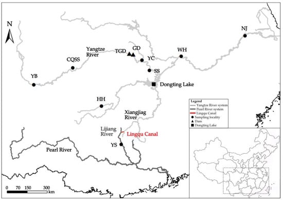 - Jin, Y.; He, K.; Xiang, P.; Wang, X.; Tong, L.; Wei, Z.; Zhang, X.; Song, Z. Temporal genetic variation of the Chinese longsnout catfish (Leiocassis longirostris) in the upper Yangtze River with resource decline. Environ. Biol. Fishes 2022, 105, 1139–1151. [Google Scholar] [CrossRef]
