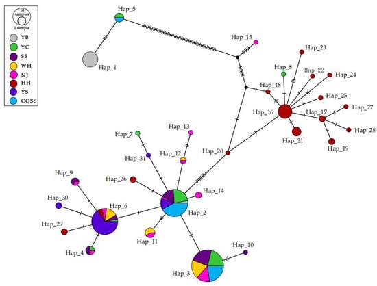 Haplotype network diagram of eight populations of Hemibagrus macropterus based on Cytb. YB, Yibin; YC, Yichang; SS, Shishou; WH, Wuhan; NJ, Nanjing; HH, Huaihua; YS, Yangshuo; CQSS, Stock seed.
